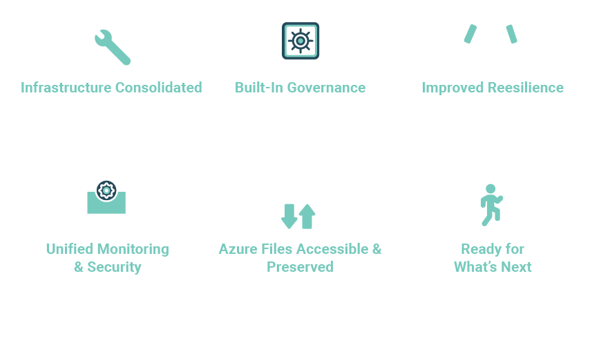 By consolidating the new acquisitions infrastructure into the current Azure environment, the Industrial Manufacturer eliminated the complexity of managing assets across multiple Azure tenants and VMware systems. The lift-and-shift approach preserved all workload functionality while bringing operations under standardized governance and security controls.